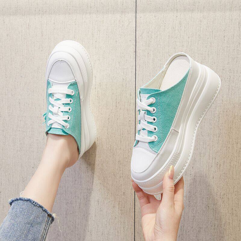 帆布真皮包头内增高半拖鞋女外穿春夏新款休闲小白鞋松糕厚底凉拖