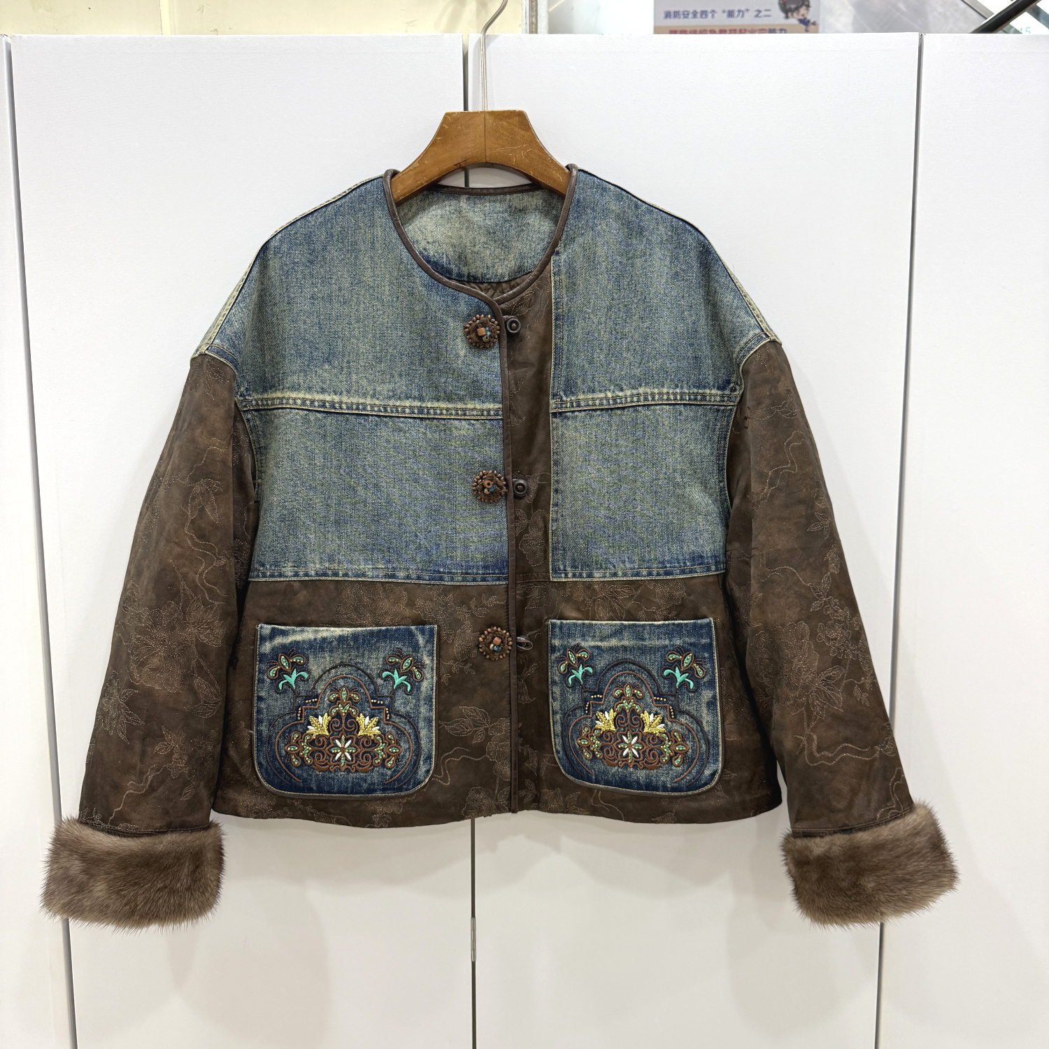 99YR-1766 欧洲站25冬绵羊皮包边水貂毛袖口牛仔拼接鹅绒羽绒服