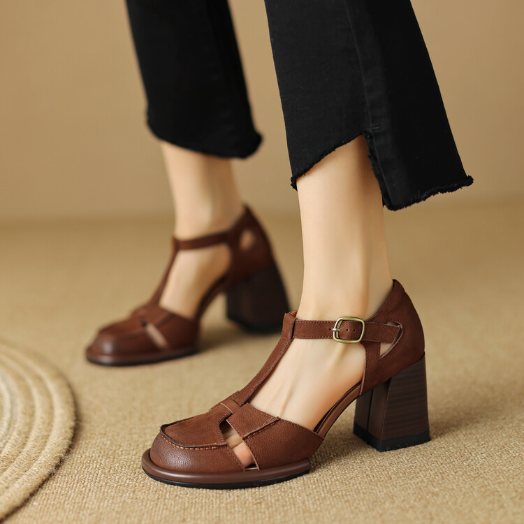手工真皮包头凉鞋女镂空复古罗马鞋圆头粗跟防水台T型带中空单鞋