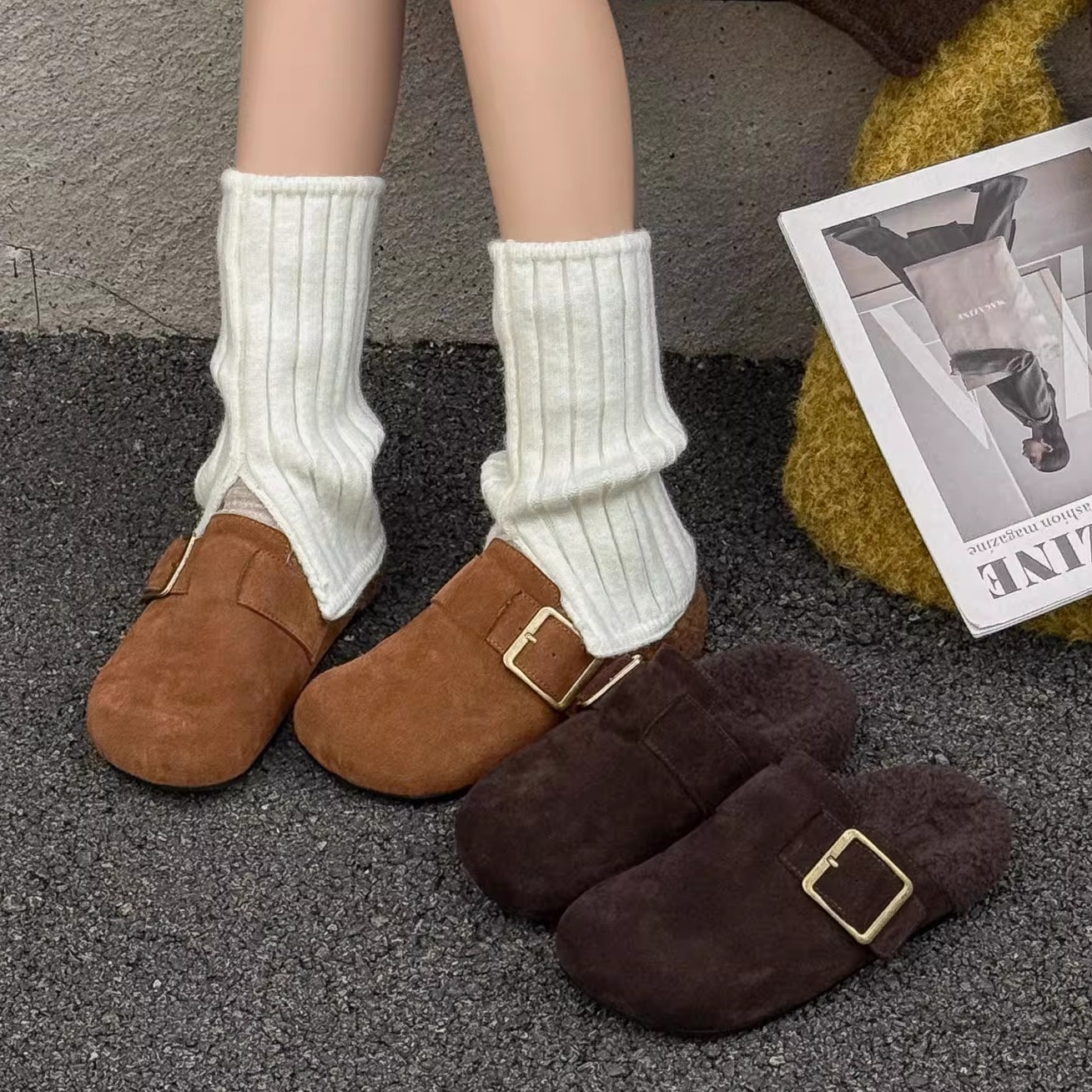 2025冬季勃肯鞋懒人金属扣带毛绒内里舒适厚底女真皮包头拖鞋外穿