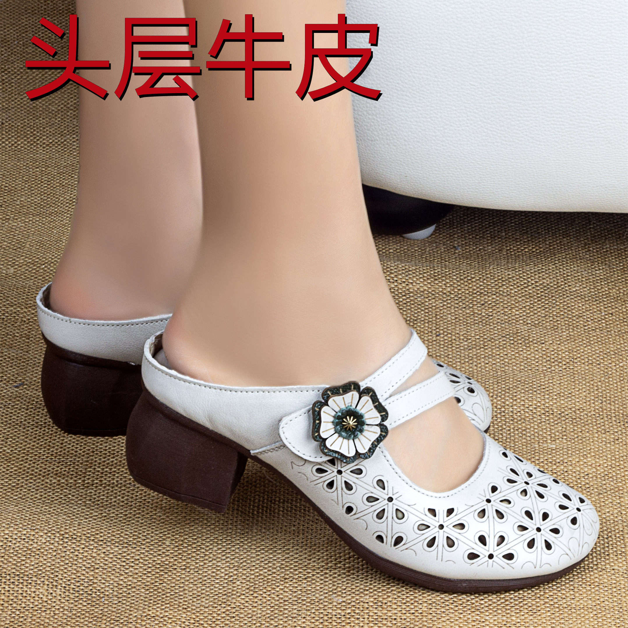 复古风真皮包头拖鞋女夏民族风粗跟镂空花朵妈妈鞋软底外穿一字拖