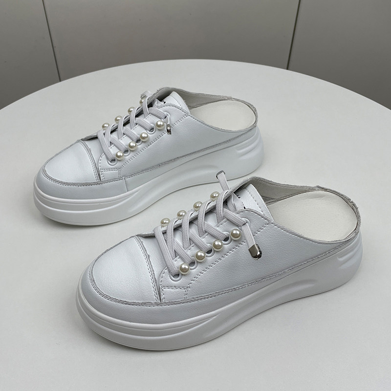 真皮包头半拖鞋女夏外穿2026新款内增高厚底网面一脚蹬懒人小白鞋