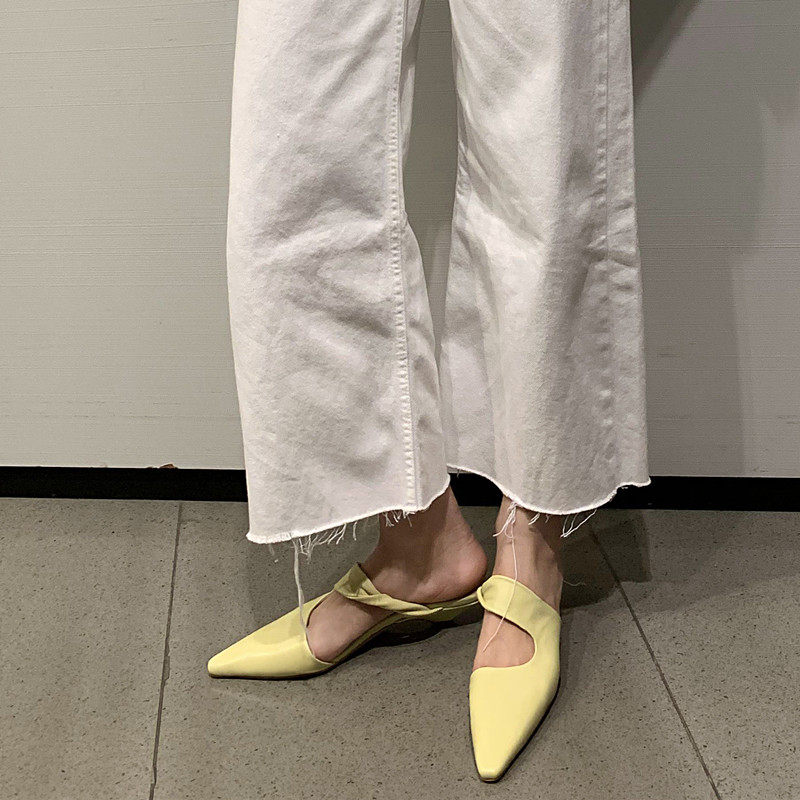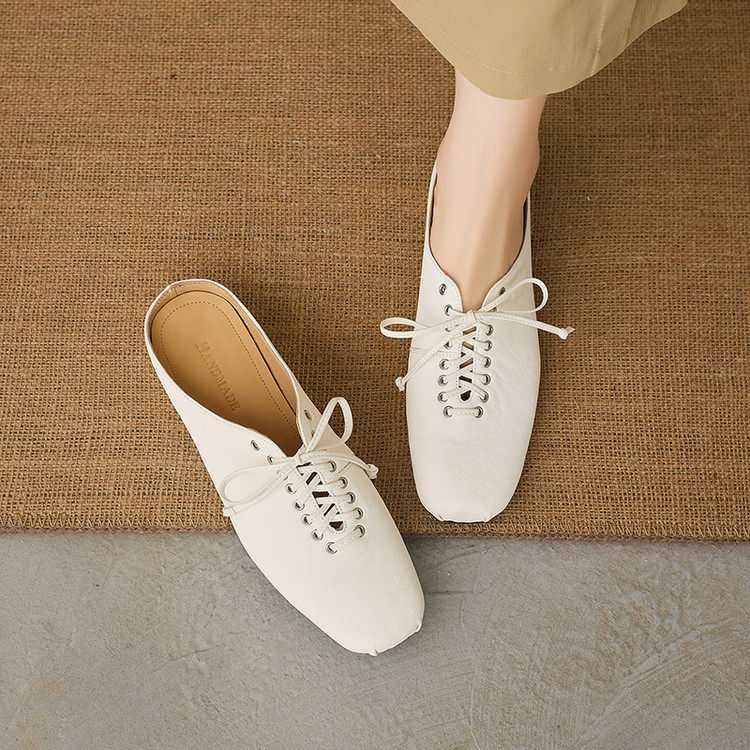 简约风真皮包头拖鞋女夏外穿一脚蹬系带平底穆勒鞋防滑米白色新品