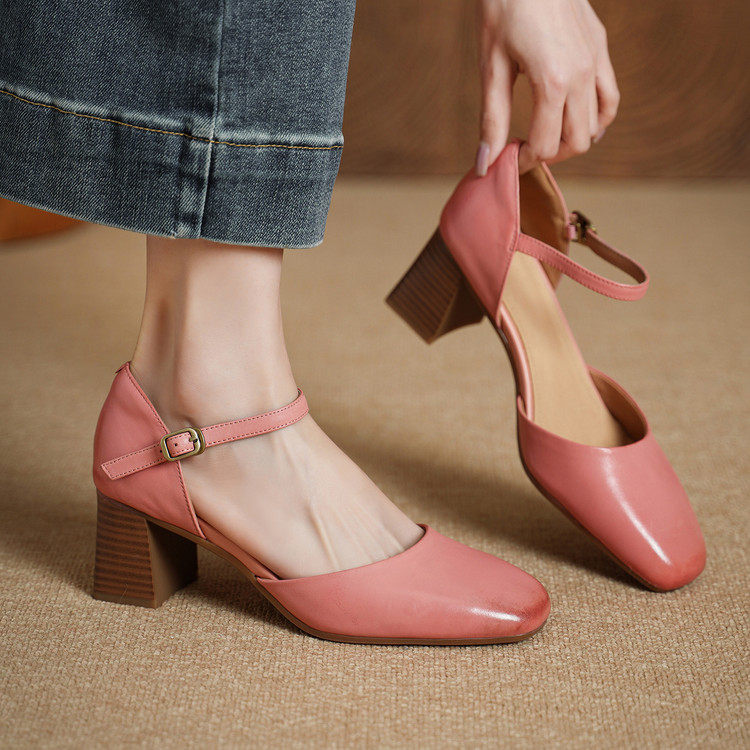 法式复古风真皮包头凉鞋女夏季粗跟方头一字扣粗高跟粉色中空包跟
