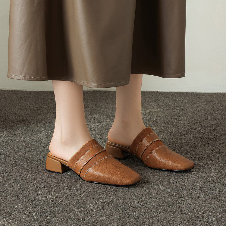 韩式真皮包头拖鞋女夏外穿粗跟一脚蹬防滑穆勒鞋休闲凉拖中跟新品