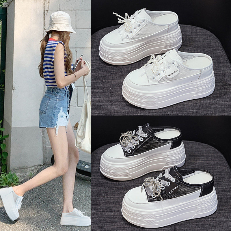 真皮包头半拖鞋女外穿2026春夏新款网面透气厚底内增高9CM小白鞋