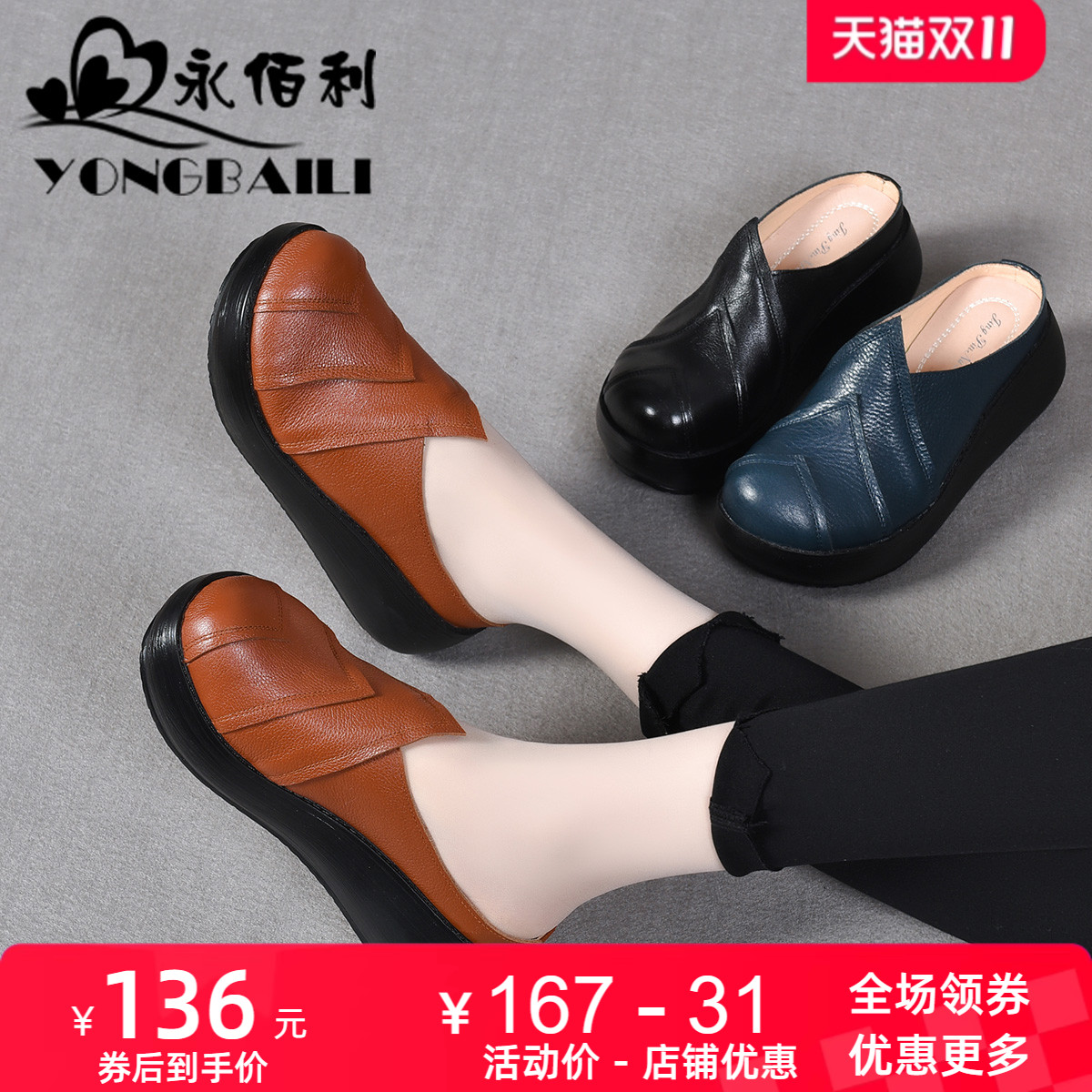 巴宝秀轻便厚底真皮包头拖鞋女2025秋冬新款百搭时尚显瘦增高半拖