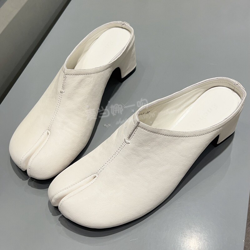 欧洲站2026春夏极简穆勒女真皮包头半拖鞋粗高跟外穿懒人分趾白色