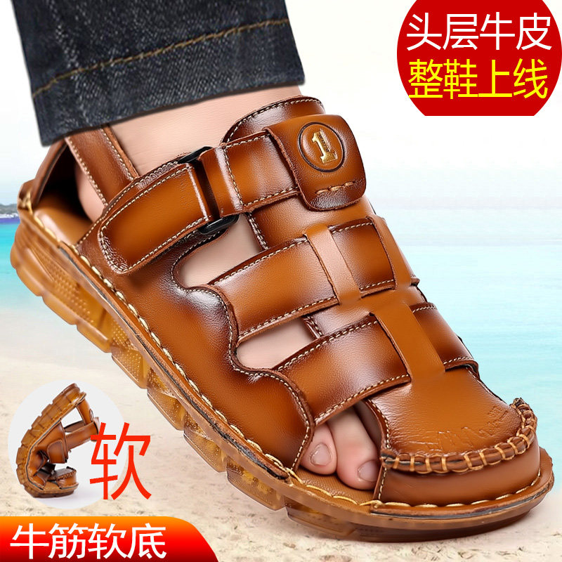 牛筋底真皮包头凉鞋男沙滩鞋手工凉鞋防滑耐磨厚底柔软舒适爸爸鞋
