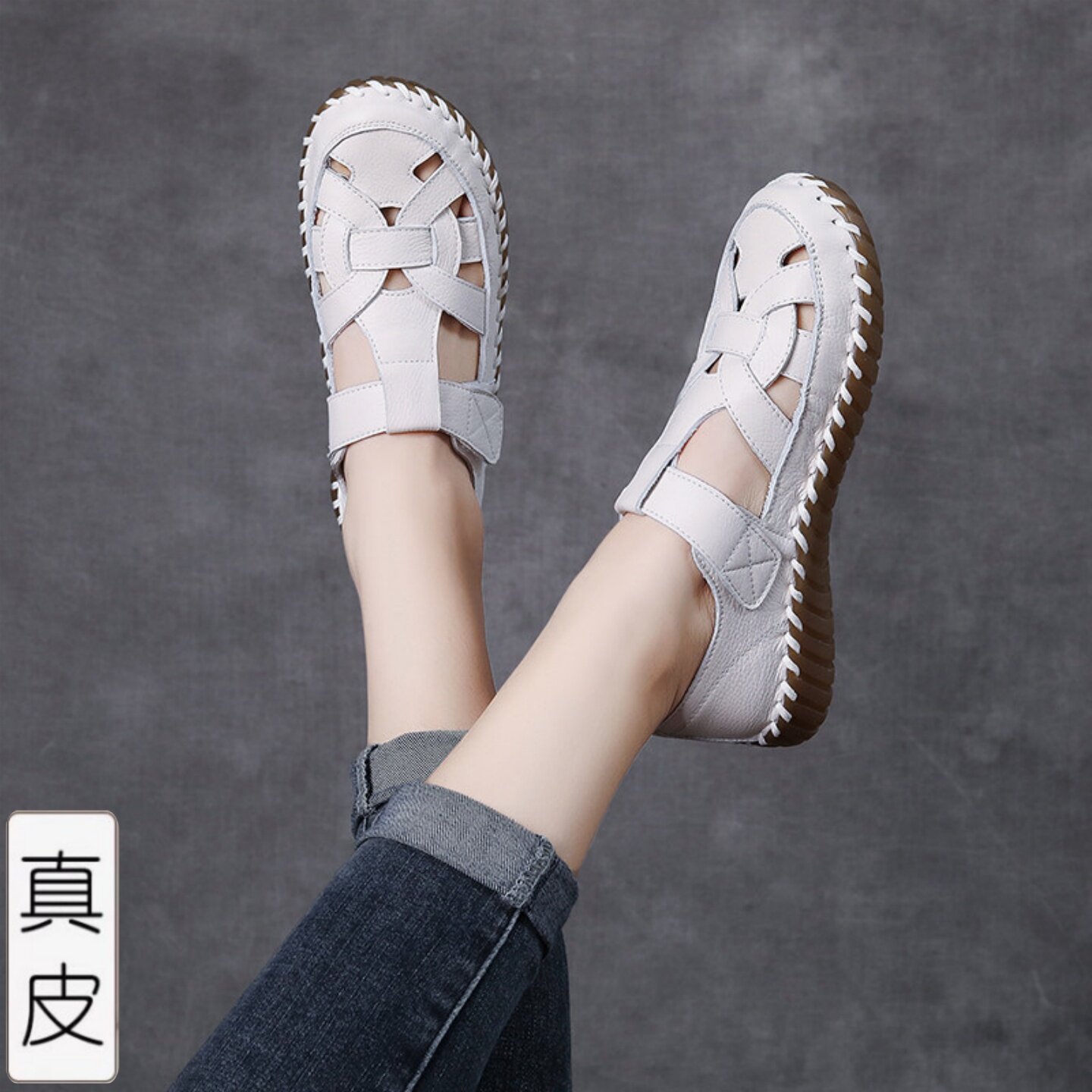 082丁字凉鞋夏新原创真皮包头包跟镂空凉鞋女圆头松糕厚底休闲