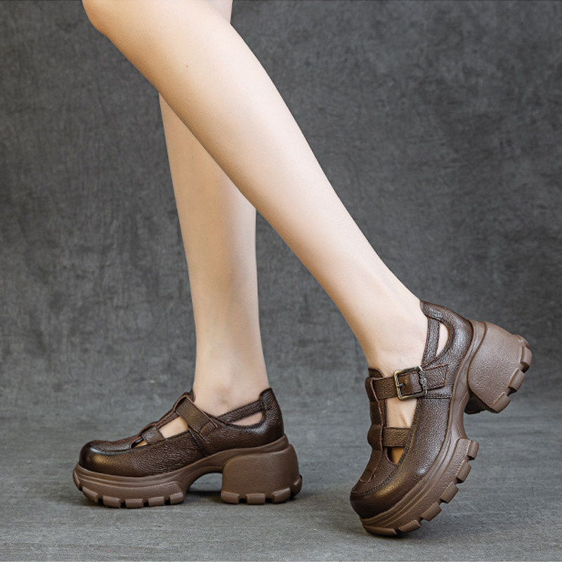 粗跟罗马凉鞋女2026夏真皮包头厚底高跟复古女鞋镂空全牛皮松糕鞋