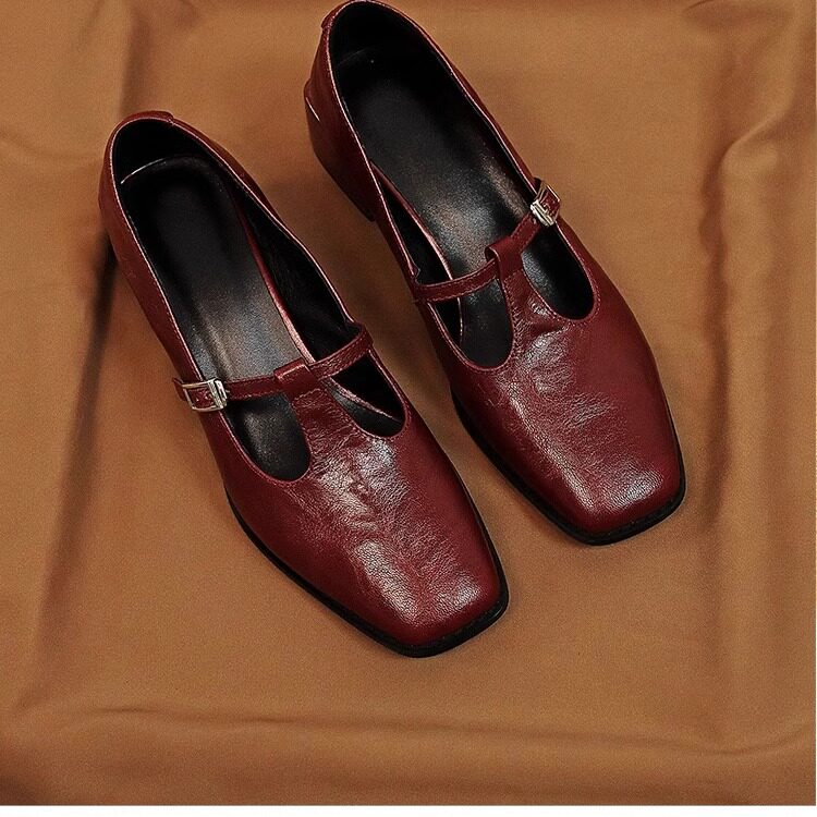 方头小羊皮包鞋女2025覆古真皮粗跟玛丽珍鞋百搭红色配裙子小皮鞋