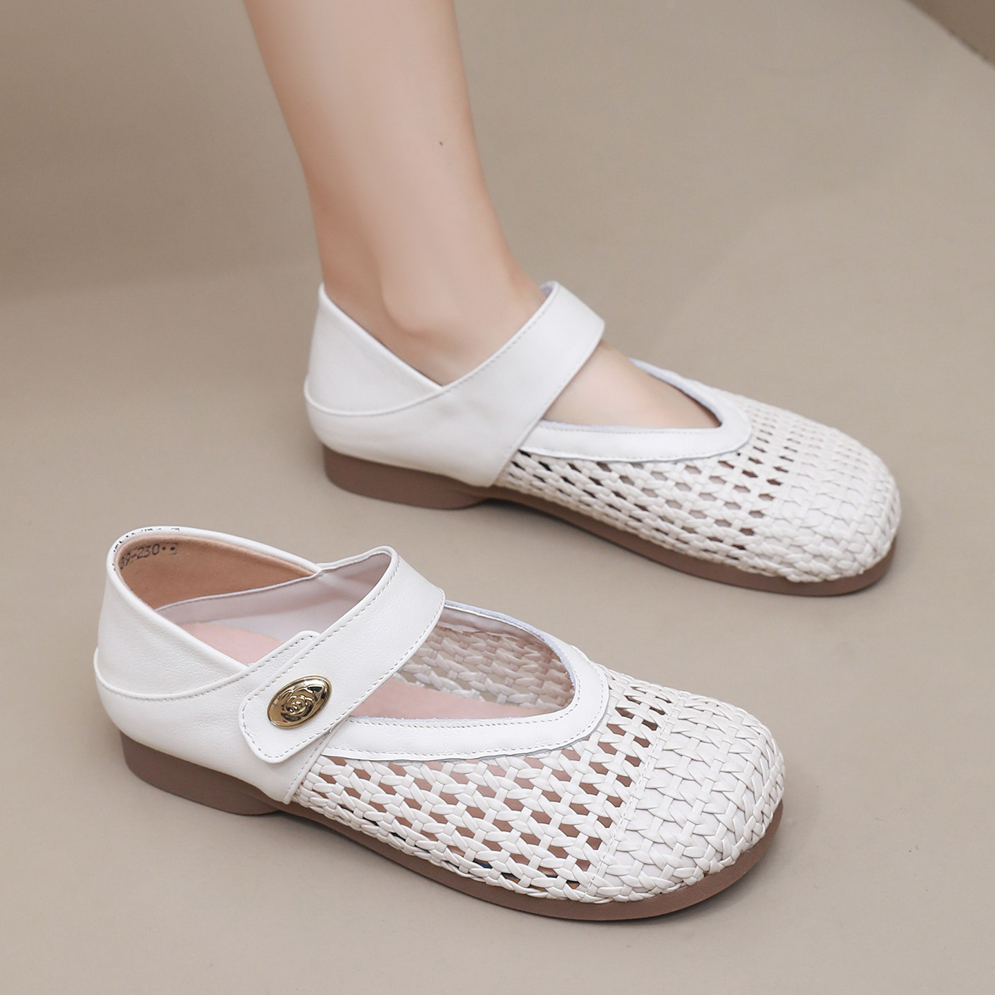真皮包头凉鞋2026夏季休闲镂空玛丽珍女鞋大码脚肥宽编织平底单鞋