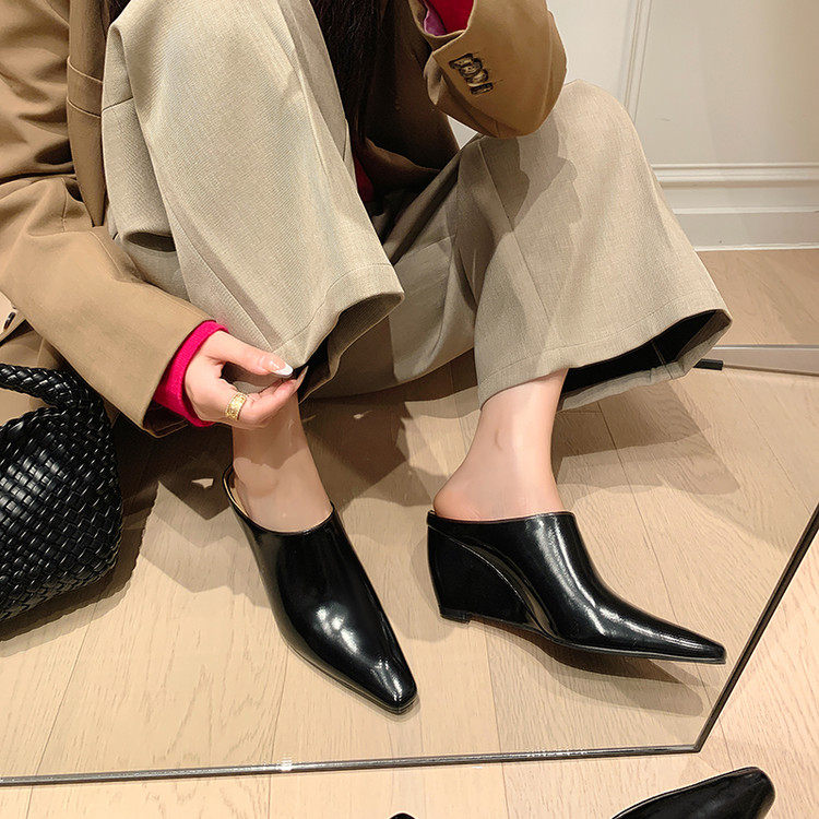 尖头坡跟穆勒鞋女2026新款真皮包头半拖银色轻奢外穿凉拖高跟单鞋