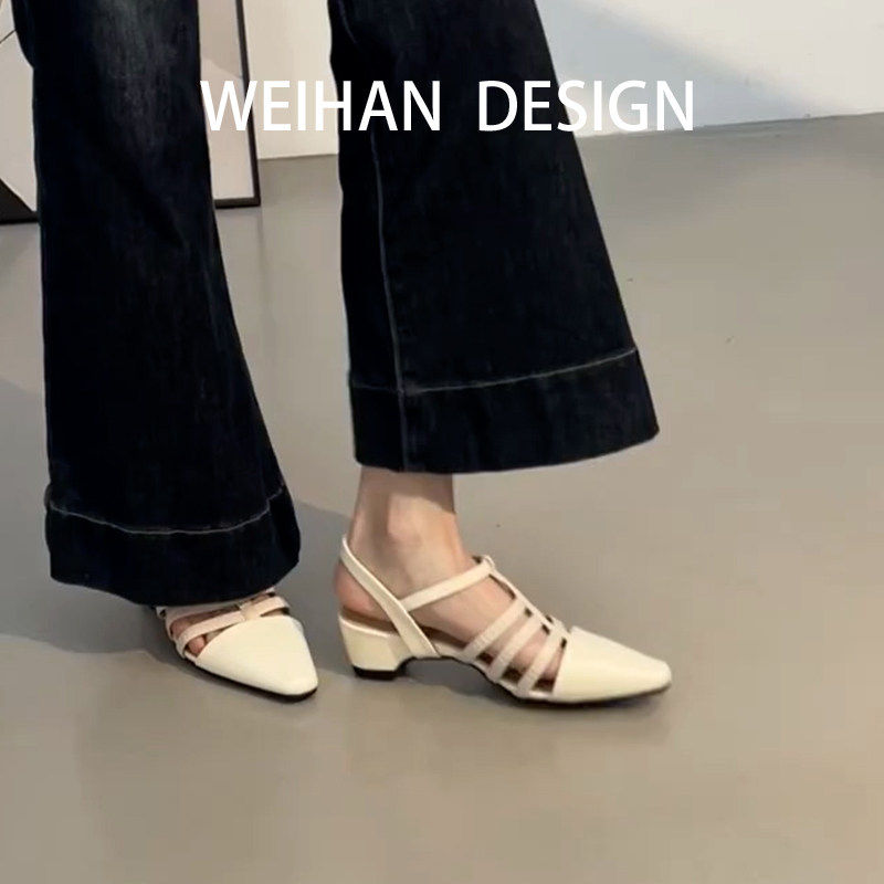 撤柜真皮包头凉鞋女春夏粗跟方头羊皮鞋子后空低跟通勤FB11114101