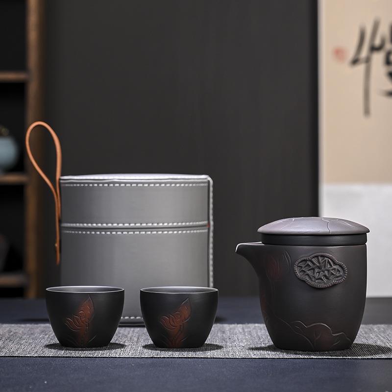 紫砂紫陶快客一壶二杯旅行茶具手工套装便携皮包整套装定|制