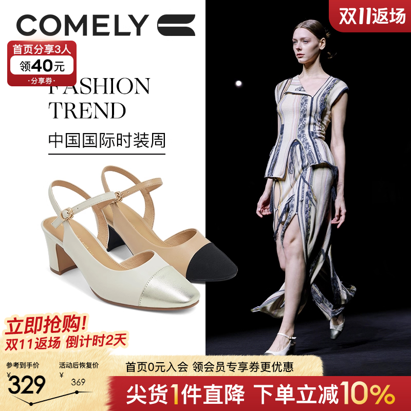 康莉真皮包头凉鞋女2025年夏季新款法式小香风粗跟一字带高跟鞋子