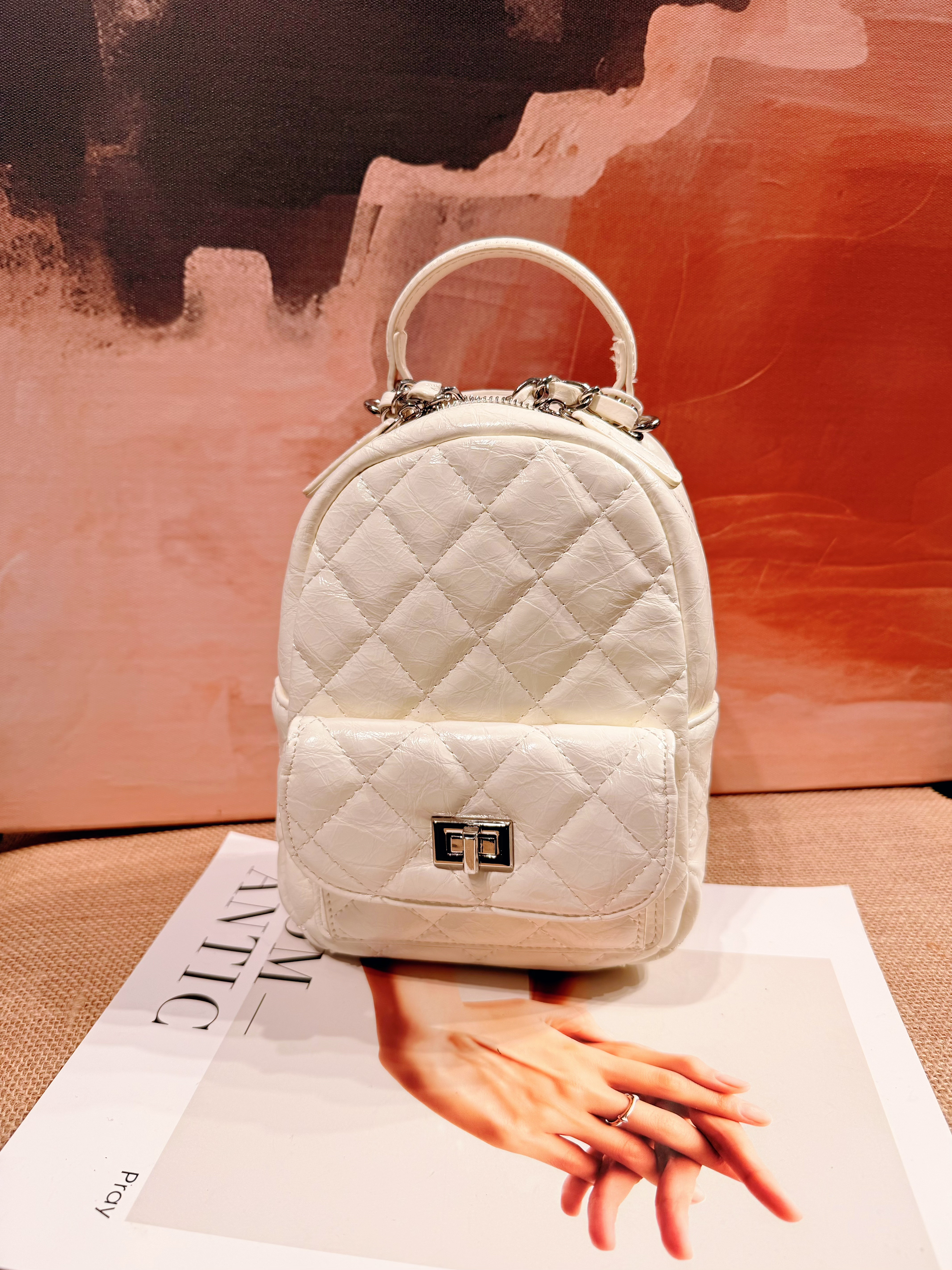 2026新款时尚手提百搭真皮油蜡皮菱格链条双肩背包高级通勤女皮包