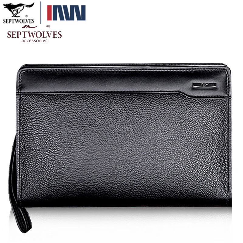 七匹狼男士手拿包头层牛皮商务手包真皮包包手抓包送爸爸中年老板 黑色大号