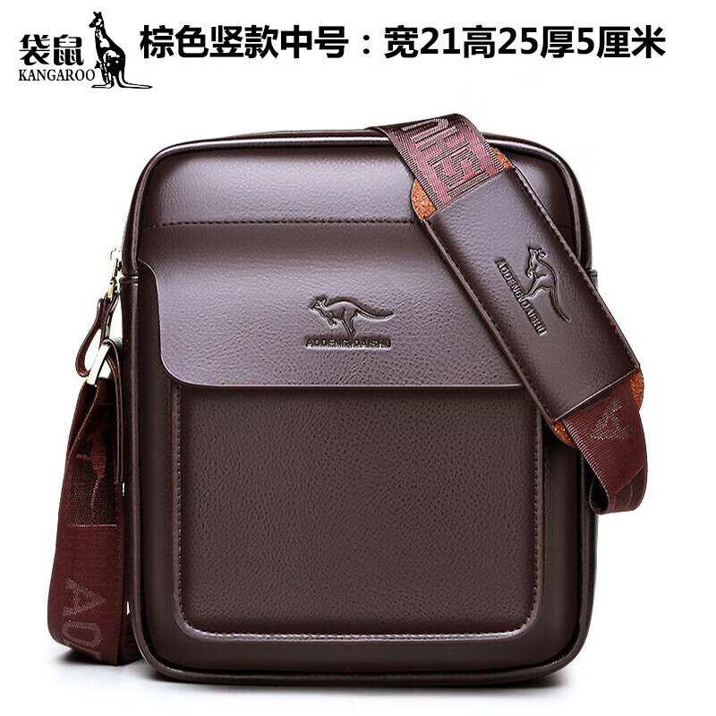 袋鼠(KANGAROO)真牛皮男包商务小背包潮牌休闲多功能牛皮包男士包包单肩斜挎包 047棕色竖款中号