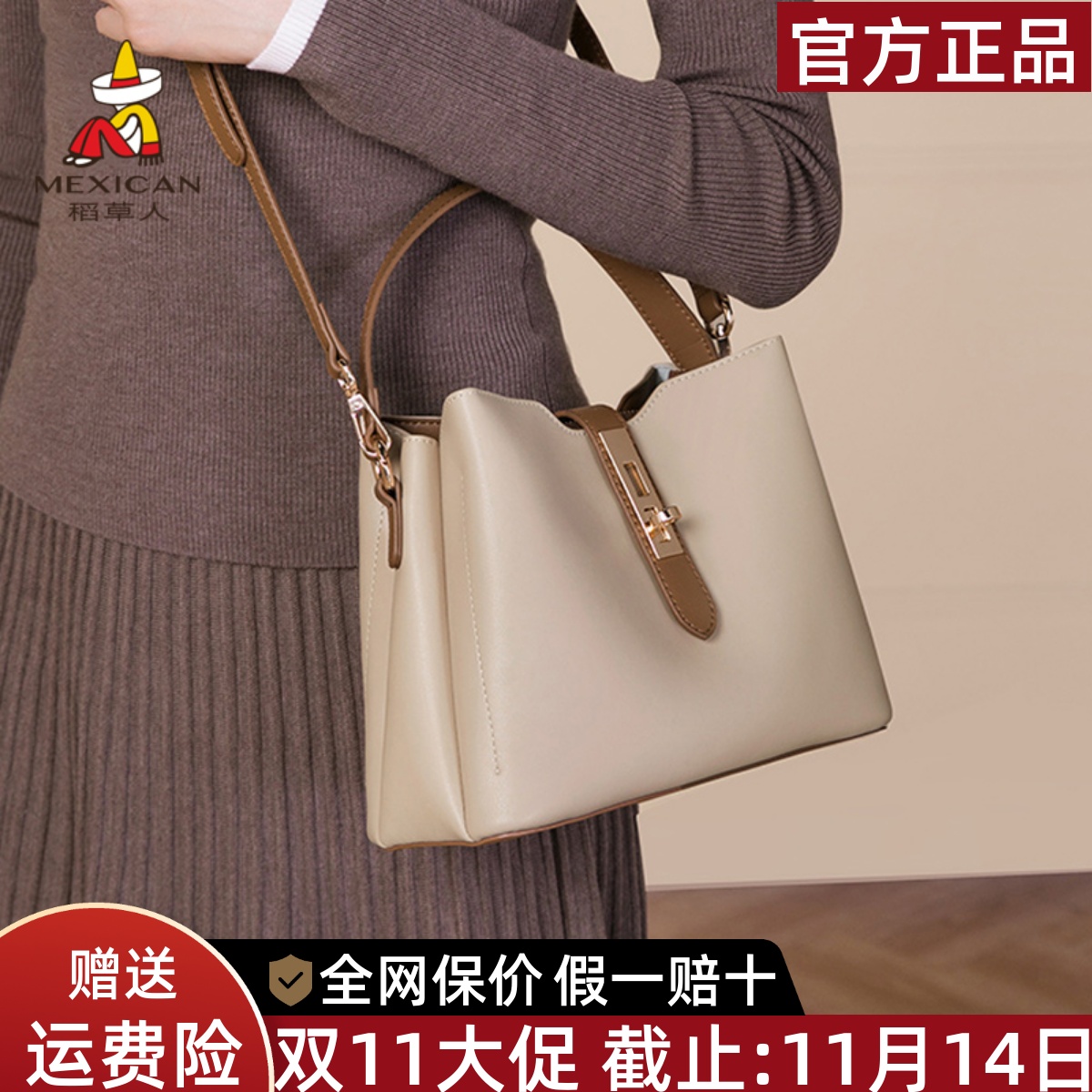 稻草人真皮包包女2025新款撞色手提水桶包小众牛皮单肩斜挎包正品