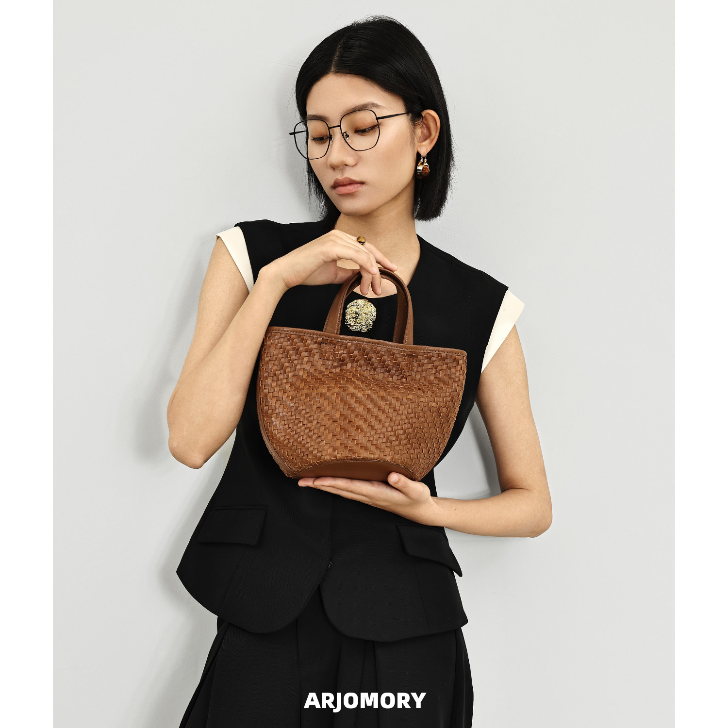 ARJOMORY新品头层牛皮菜篮子编织包2026夏季度假风女包单肩手提包