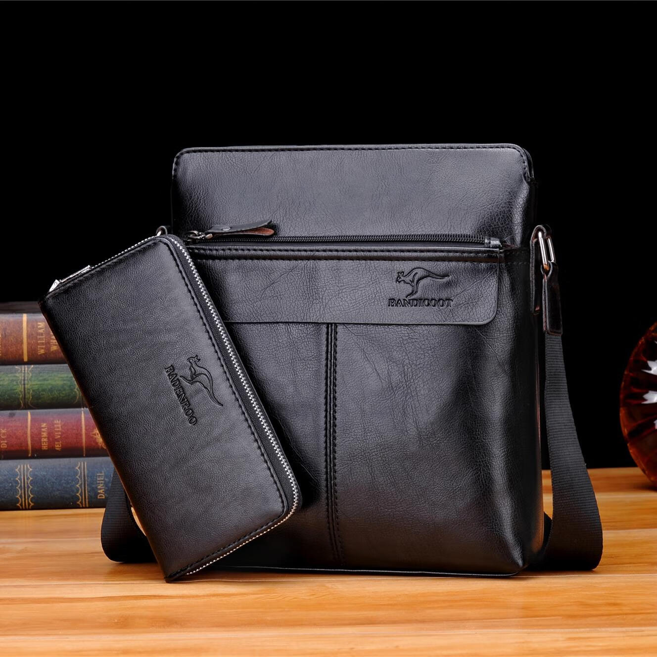 袋鼠(KANGAROO)男包单肩包斜挎包男士真皮商务休闲包包小挂包竖款时尚背包男皮包 黑色送手包+卡包