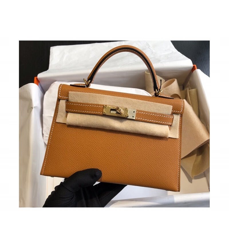 酷奇包包小香儿高端品质真皮包女新款二代mini凯莉包金扣单肩斜挎小手提包 焦糖小号 赠送丝巾