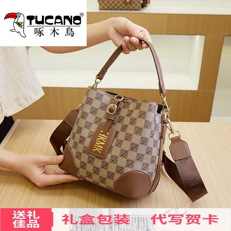 啄木鸟(TUCANO)品牌眞皮包包女包高级感百搭老花水桶包时尚单肩斜挎包女生日礼物 送女友老婆礼盒装】卡其色