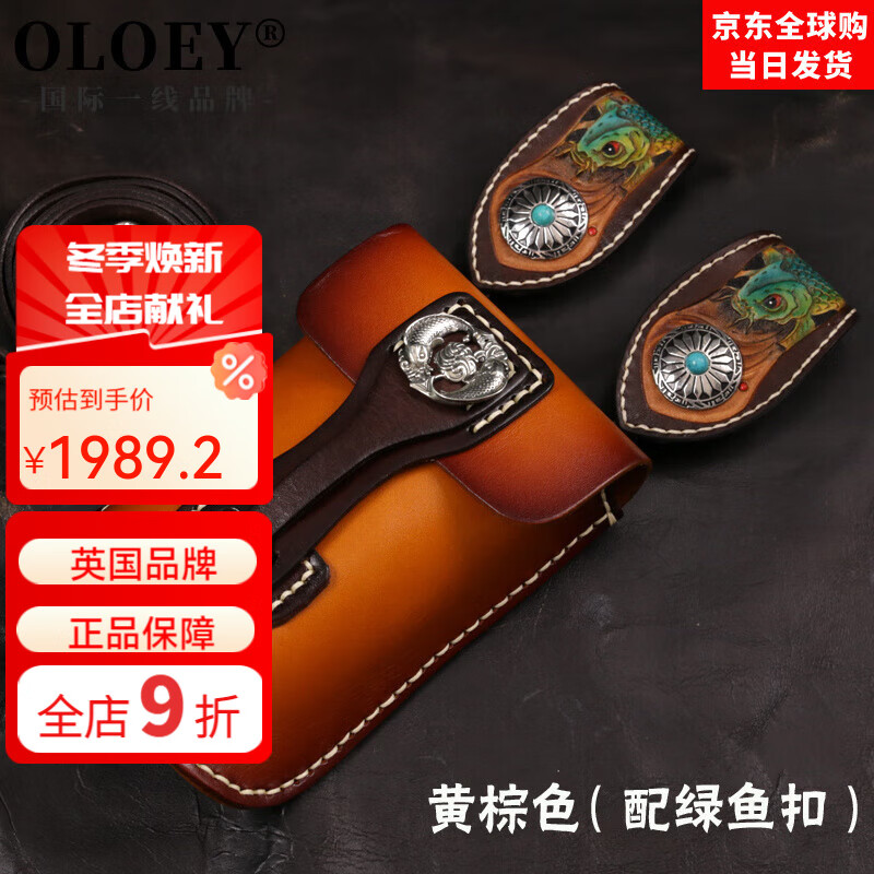OLOEY国际一线品牌鱼腰包 原创皮雕腰包头层牛皮包男真皮手工雕刻 黄棕色 配绿鱼扣