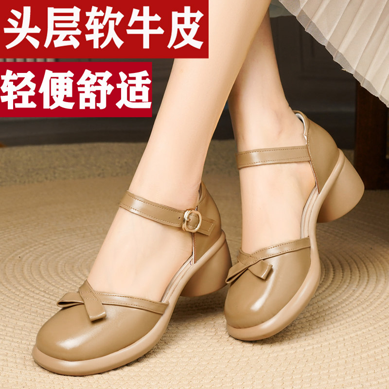 真皮包头凉鞋夏季粗跟一字扣带中空女鞋高跟厚底防滑舒适妈妈皮鞋