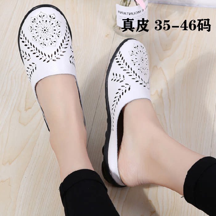 真皮包头镂空半拖鞋夏季女鞋4243444546大码外穿透气平底凉拖鞋子