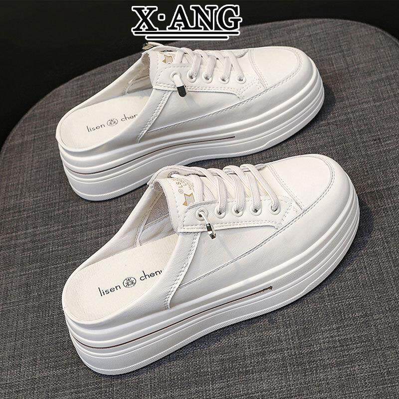 真皮包头厚底爆款半拖鞋女夏松糕休闲小白鞋网面透气外穿增高凉拖