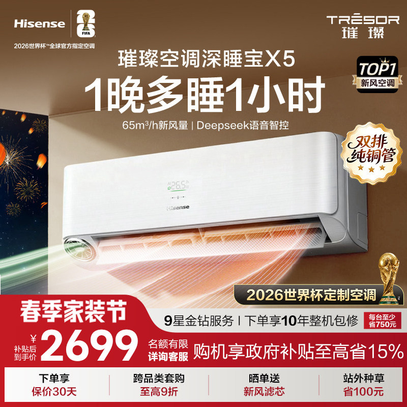 世界杯定制空调海信深睡宝X5新风大1.5匹一级能效变频卧室挂机