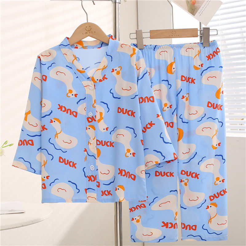 A类儿童天丝莫代尔无骨睡衣男女夏季中大童七分袖空调家居服套装