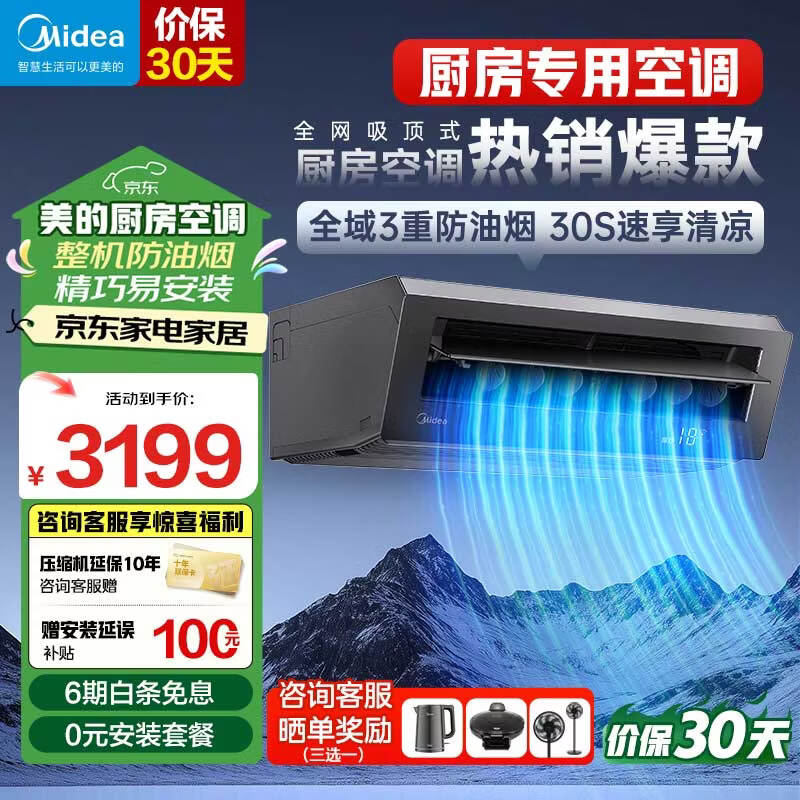 美的(Midea)厨房空调 小凉方 吸顶式1.5匹 新等级能效 变频节能省电 防油烟大冷量家用厨房专用空调 厨房空调 1.5匹 吸顶式XD300【黑色】