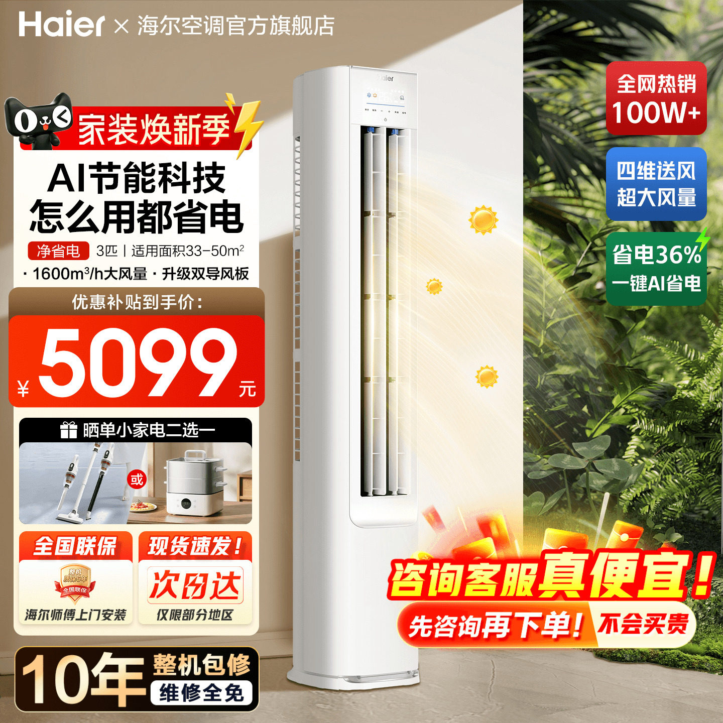 【纯铜管】海尔空调3匹2匹家用一级变频客厅冷暖立式柜机净省电E1