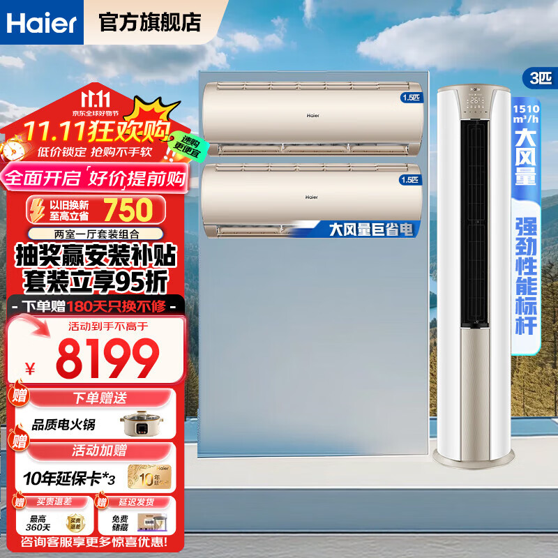 海尔空调套装一套购齐立式柜机三室一厅节能变频新一级能效冷暖家用三室二厅自清洁 净畅挂机+静悦柜机 【两室一厅 全一级能效】3匹柜机+1.5匹挂机*2