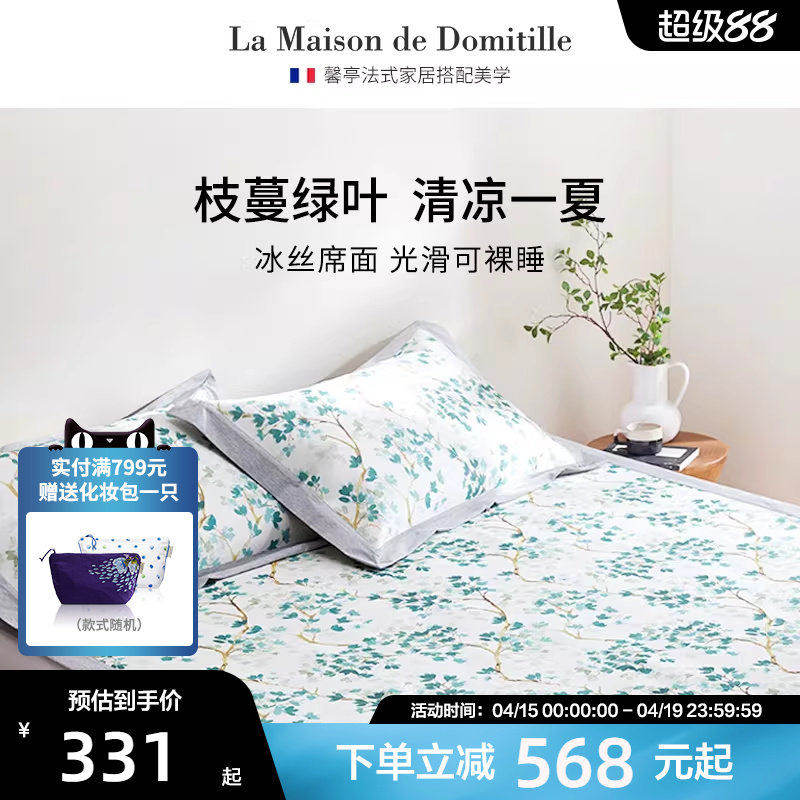 馨亭印花冰丝席三件套可折叠花卉凉席单双人夏季空调软席子家用