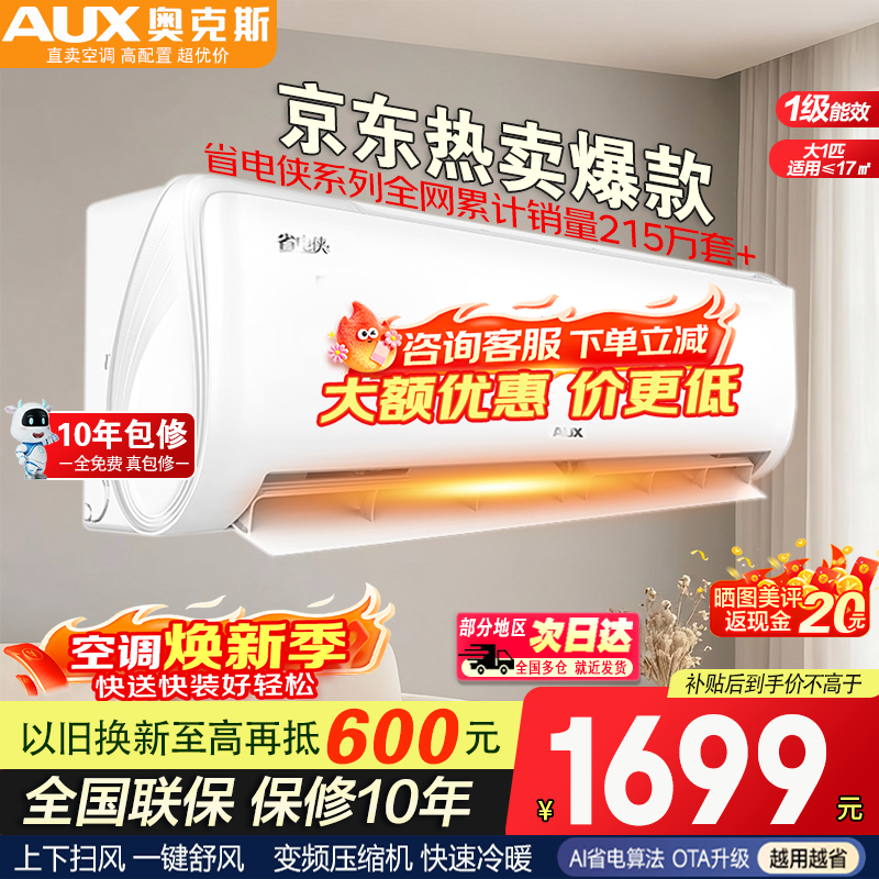 奥克斯(AUX)空调大一匹1.5匹新一级能效节能省电侠变频冷暖两用家用智能温控防直吹健康自清洁单冷挂机 省电侠 大1匹 新一级能效 变频冷暖 ECO节能30%
