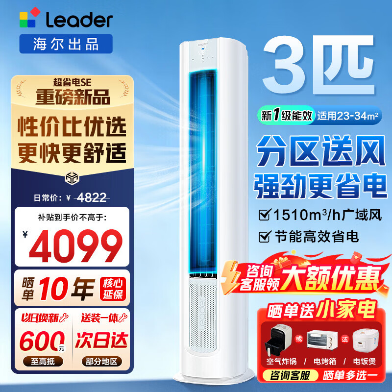 海尔空调出品统帅3匹新一级能效客厅立式柜机家用节能变频冷暖空调 超省电se 3匹 【升级款】双翼全域风+自清洁