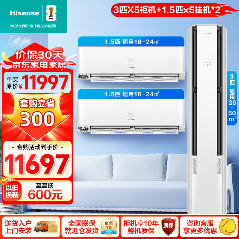 海信(Hisense)新风空调套装 X5系列 大1.5匹/大3匹 AI洁净新风 语音智控 新一级能效 挂机+立式空调柜机组合套 35X5新风挂机+72X5新风柜机(两室一厅)