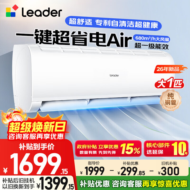 海尔空调出品大1匹新一级超省电统帅空调挂机变频家用一级能效变频冷暖壁挂式卧室空调以旧换新补贴 一键超省电+APF值5.28+全年省电18%