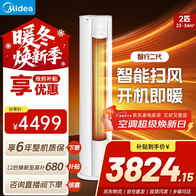 美的空调立式柜机 国家补贴15% 静优风 智行二代3匹 新一级能效变频冷暖 客厅低噪防直吹 以旧换新 智行二代 大2匹 一级能效大风口【新款】