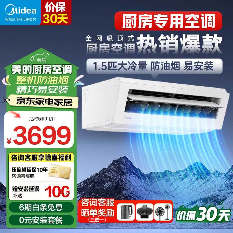 美的(Midea)厨房空调 小凉方 吸顶式1.5匹 新等级能效 变频节能省电 防油烟大冷量家用厨房专用空调 厨房空调 大1.5匹 吸顶式XD200【白色】