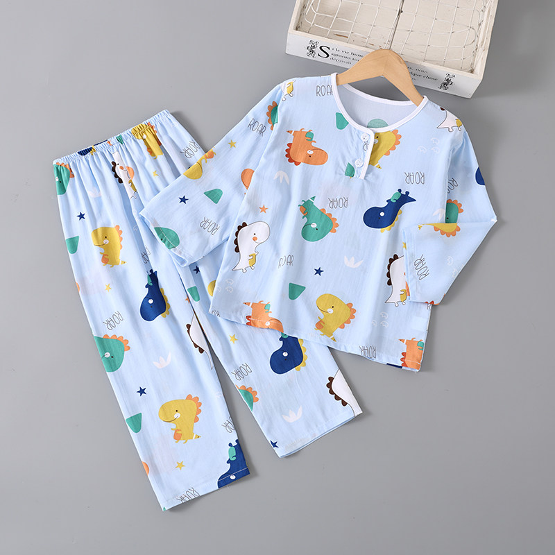 夏季儿童卡通棉绸睡衣男孩女孩薄款长袖套装绵绸男宝宝空调家居服