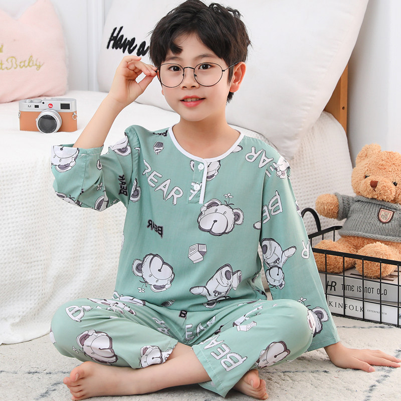 夏季儿童棉绸睡衣男童绵绸长袖薄款睡衣套装男孩中大童空调家居服