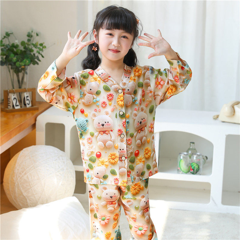 2026新款儿童春夏季女童棉绸套装薄款宝宝空调服男童女孩绵绸睡衣