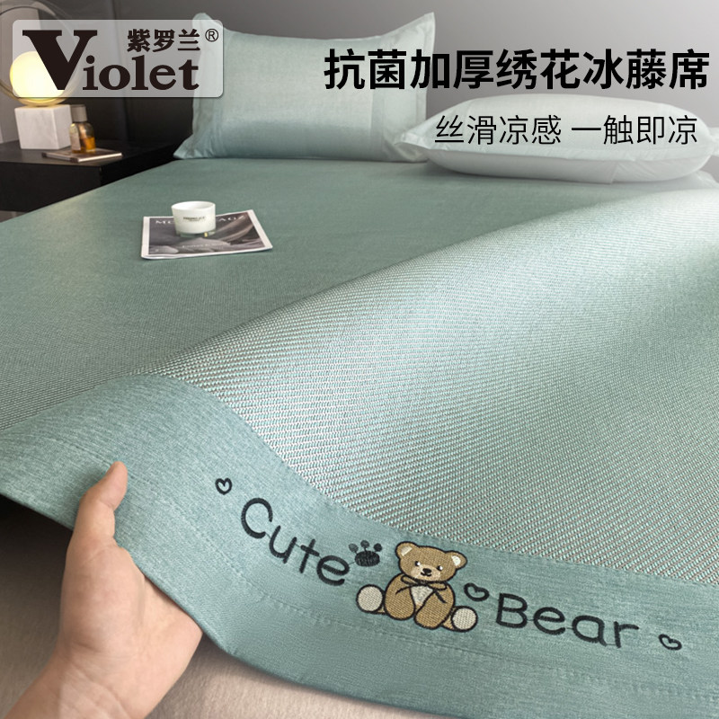 紫罗兰加厚凉感卡通绣花冰藤席三件套可水洗折叠夏凉席宿舍空调席