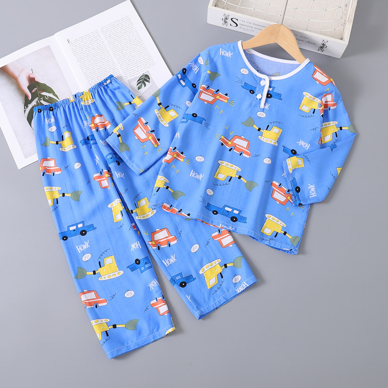薄款夏季儿童长袖棉绸睡衣女童宝宝男童男孩绵绸家居服空调服套装